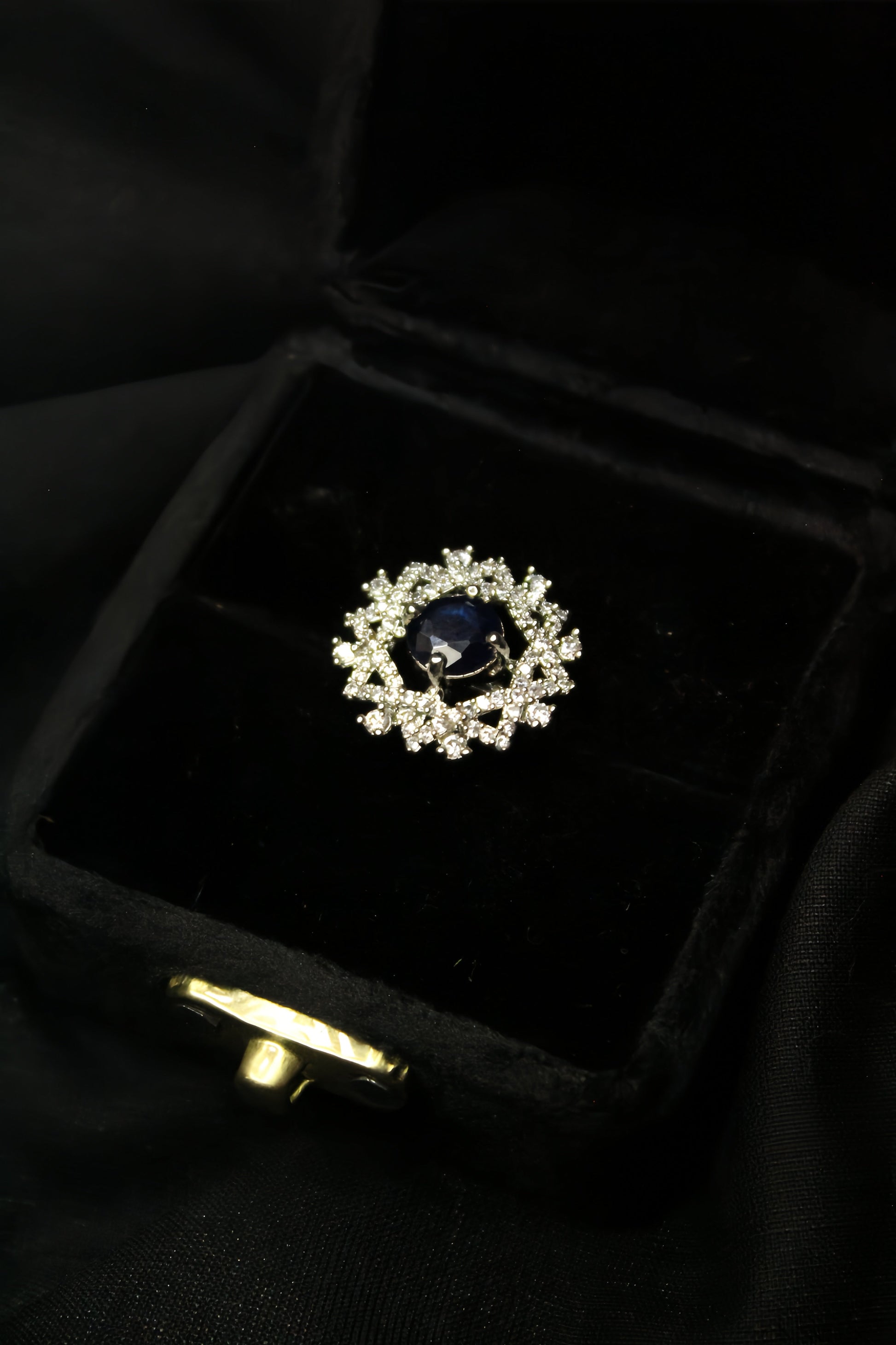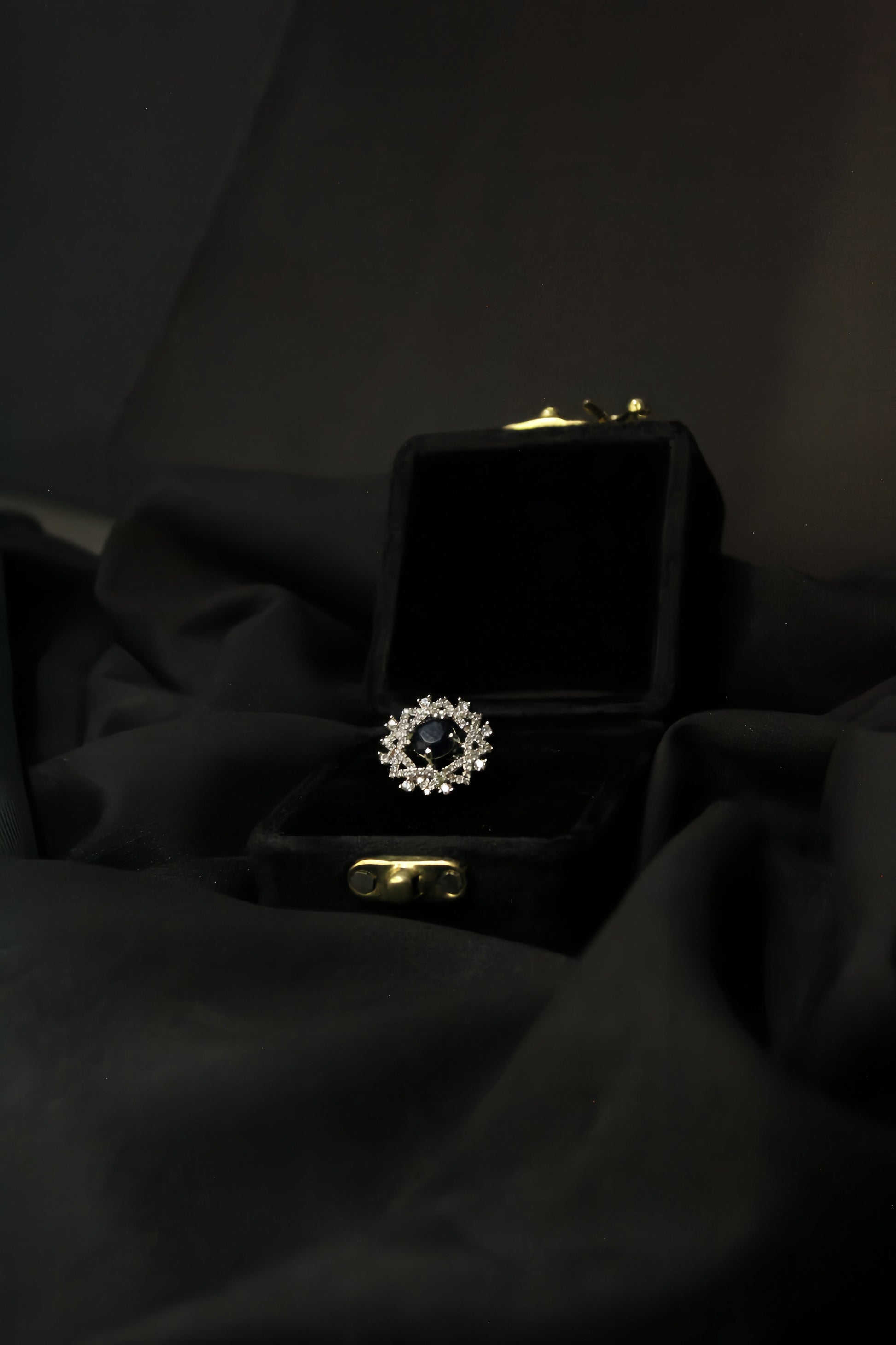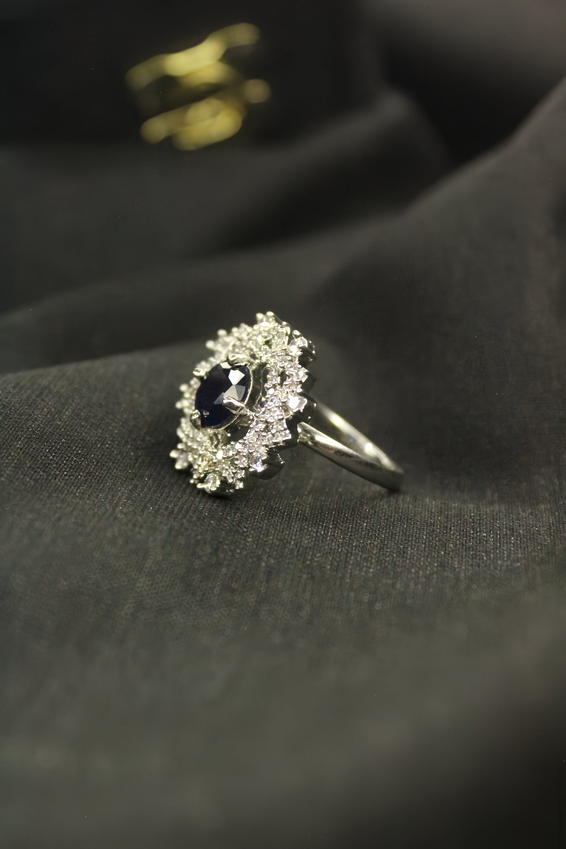Elegant ring with a dark gemstone and diamond-studded band