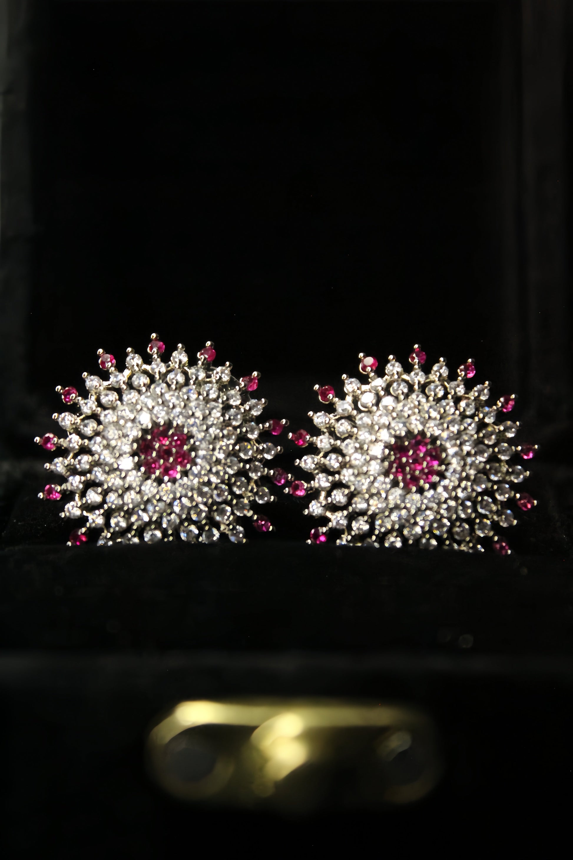 These earrings feature a vibrant center of ruby-toned stones surrounded by multiple layers of dazzling white crystals. The edges are delicately dotted with tiny ruby-colored stones